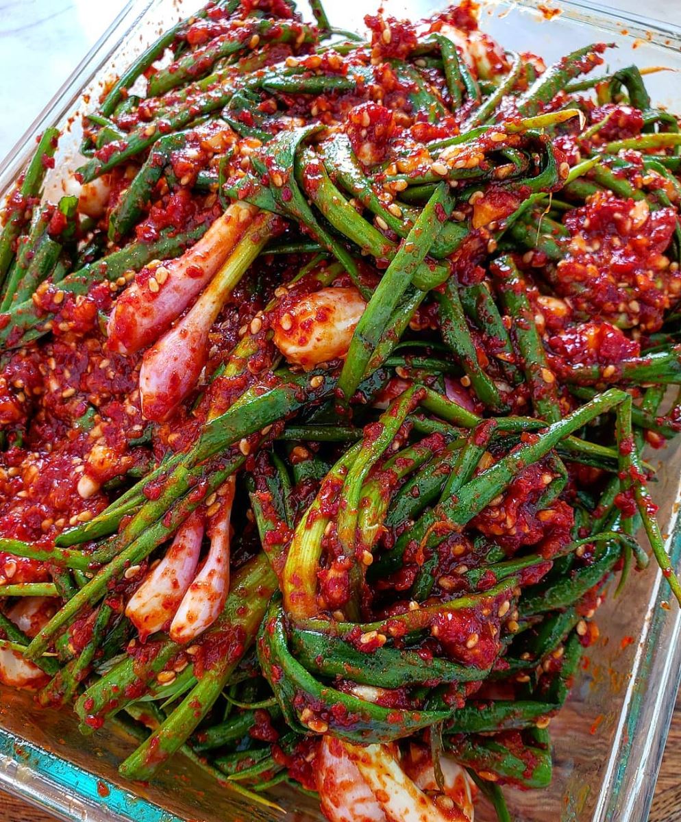 Kim chi hành lá với nguyên liệu chính là hành lá, tỏi, ớt,... Ngoài độ hăng nhẹ của hành lá, cay cay của bột bớt và vị chua đặc trưng, loại kim chi này còn có vị giòn giòn của củ hành làm món kim chi trở nên ngon và lạ miệng.